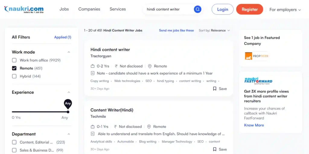 • हिन्दी कंटैंट रायटर के लिए नौकरी डॉट कॉम साइट सबसे बेस्ट है। जहां पर जाकर आप हिन्दी कंटैंट राइटिंग सर्च करके काम को ढूंढ सकते है। इसमें आपको अलग अलग ब्लॉग, कंपनी के कंटैंट रायटर की requirement की जानकारी मिल जाती है।