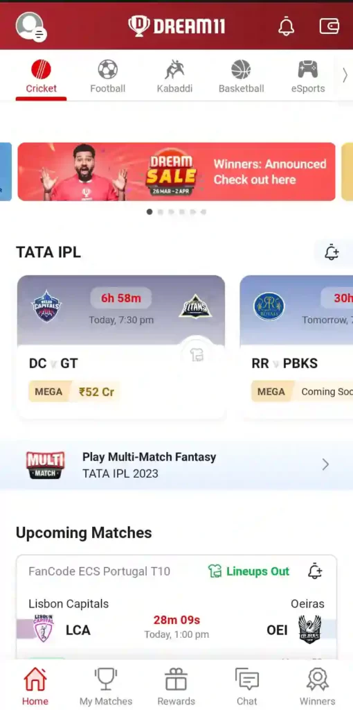 जैसा कि मैने बताया है आपको पहले Dream11 App डॉउनलोड करके उसमें एकाउंट बना लेना है अब Team Create करने के लिए फिर से Dream11 App को ओपन करे जहाँ इसे ओपन होने पर कुछ इस तरह का ऑप्शन देखने को मिलेगा