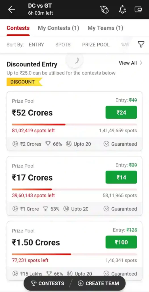 Dream11 में टीम बनाने के बाद 2 करोड़ कंटेस्ट या किसी को ज्वाइन करने का आसान सा तरीका है कि आपको उस कंटेंट पर कि्लक करना है और अपने Dream11 के वॉलेट से उतने पैसे कटवाकर उस कंटेस्ट को ज्वाइन कर लेना है जिसका तरीका इस प्रकार है