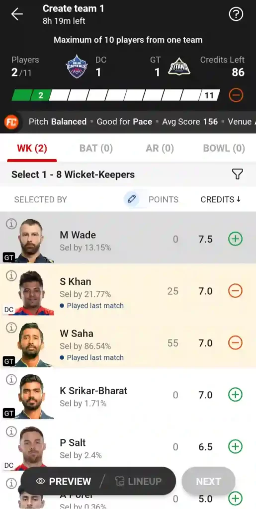 तो सबसे पहले आप Wicket Keepers सेक्शन में 1 से 2 Wicket Keepers को चुने यहाँ आपको वह Wicket Keepers चुनने है जो आज के मैच में बेस्ट खेल सके तो आप अपने हिसाब से 1 या 2 Wicket Keepers चुन लीजिए