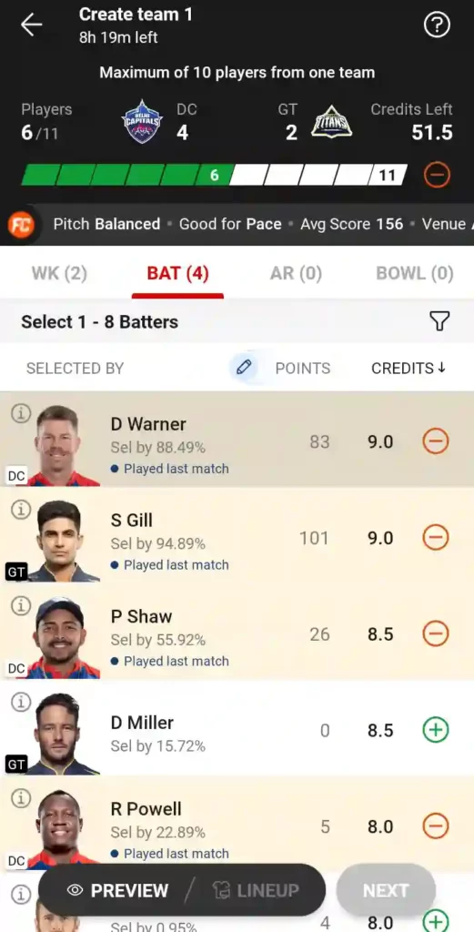 अब इसी प्रकार Batters वाले सेक्शन पर कि्लक करके आपको 3 से 4 Batters अर्थात बैटमैन चुनने है जो आज के मैच में अच्छा खेल सके बस ध्यान रखे कि आपको दोनो टीमो से प्लेयर चुनने होगे