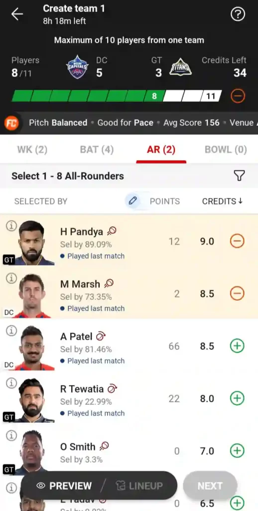 जब आप Create Teem पर कि्लक करते है आपके सामने दोनो टीमो के सभी 22 प्लेयर दिखाई देगे जहाँ आपको अपने Best 11 प्लेयर चुनकर अपनी टीम बनाना है