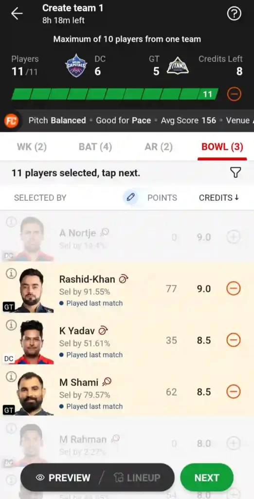 अब बारी आती है Bowlers चुनने की तो यहाँ से भी आप 3 से 4 Bowlers चुन सकते है जो आज के मैच में अच्छी बॉलिंग कर सके और अपनी टीम के लिए विकेट ले सकते है ऐसे 3 से 4 बालर आपको लेलेक्ट कर लेना है और नीचे दिये गये “Next” के ऑप्शन पर कि्लक करना है