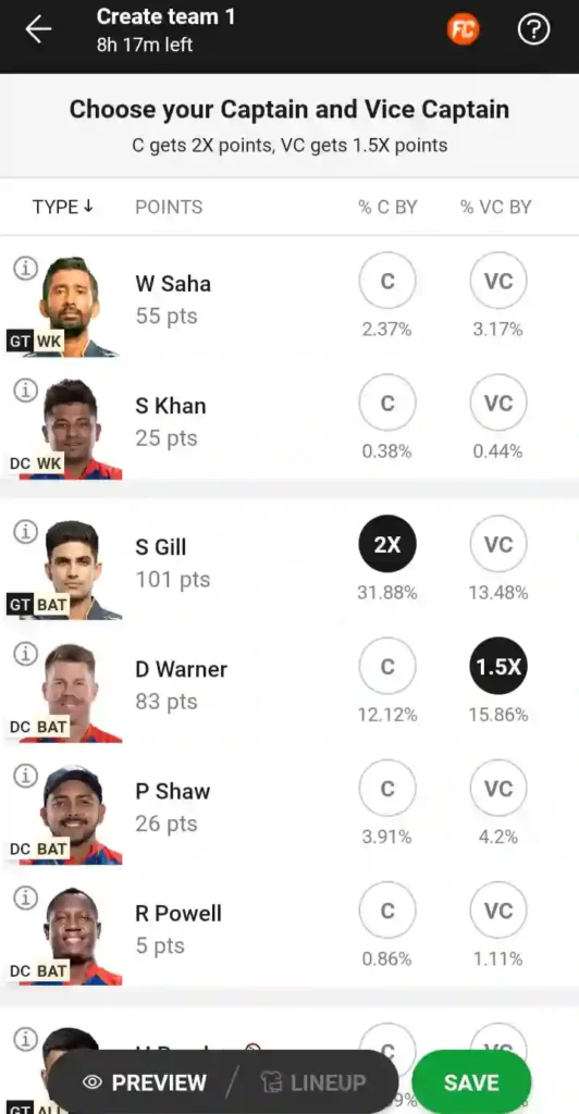 जब आप 11 प्लेयर की टीम चुवते है फाइनल में आपको कैपटन और वाइस कैपटन चुनने का विकल्प मिलता है जहाँ आप किसी को कैपटन और वाइस कैपटन बना सकते है जहाँ सबसे बेस्ट 2 प्लेयर आपको चुनना होता है