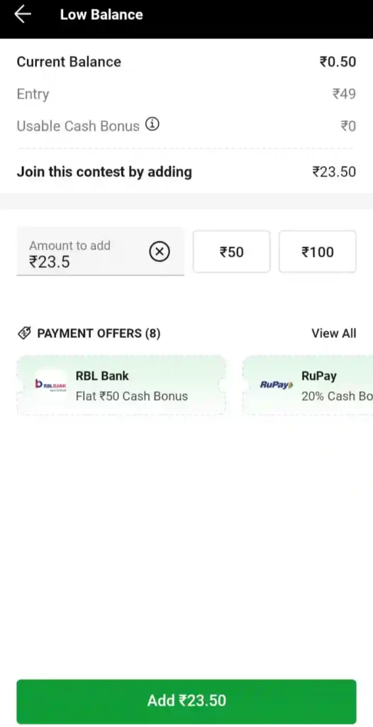 5. अगर आपके Dream11 के वॉलेट में 49 रूपये है तो आप “Join Now” पर कि्लक करके इस कंटेस्ट को ज्वाइन कर सकते है या फिर बैलेंस नही है तो उतना बैलेंस Add करके भी इस कंटेस्ट को ज्वान कर सकते है
