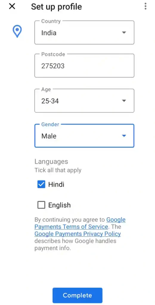 Step 6. जब आप Start Now के ऑप्शन पर कि्लक करते है अब आपको प्रोफाइल सेट करना होगा जिसके लिए आपको अपना Country, Pin Code, Date Of Birth, Gender और अपनी Language आदि भरकर Complete के ऑप्शन पर कि्लक करना।