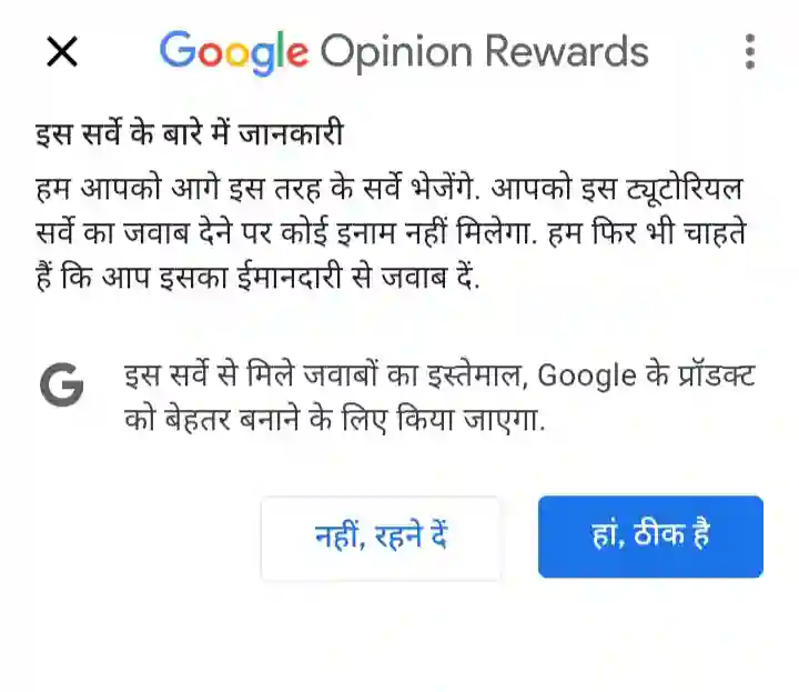 Google Opinion Rewards गूगल का ही एक Survey App है जिसमें आप सर्वे करके रिवार्ड कमा सकते है यह सर्वे एक तरह के Question Answer होते है जहाँ कोई User सवालो के जवाब देकर पैसे कमा सकता है और इस पैसे से Google Play Store की कोई App फ्री में डॉउनलोड कर सकता है।