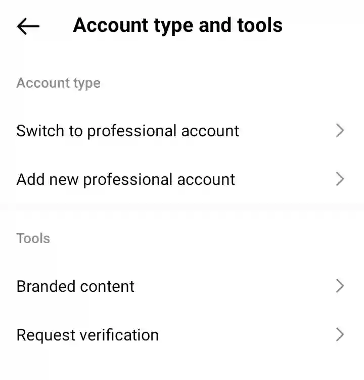 जब आप Account Type And Tools पर कि्लक करते है आपके सामने दो ऑप्शन दिखाई देगा जिसमें पहला Switch To Professional Account और दूसरा Add New Professional Account तो आप Switch To Professional Account पर ही कि्लक करना है