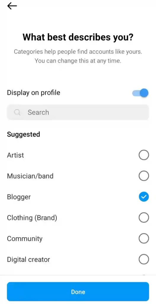 जब आप 4 बार Continue पर कि्लक करते है तो आपको अगले पेज पर अपने Instagram Page का कटेगरी चुनना होगा आप जिस कटेगरी में अपना पेज बनाना चाहते है वह कटेगरी चुने और नीचे Done पर कि्लक कीजिए
