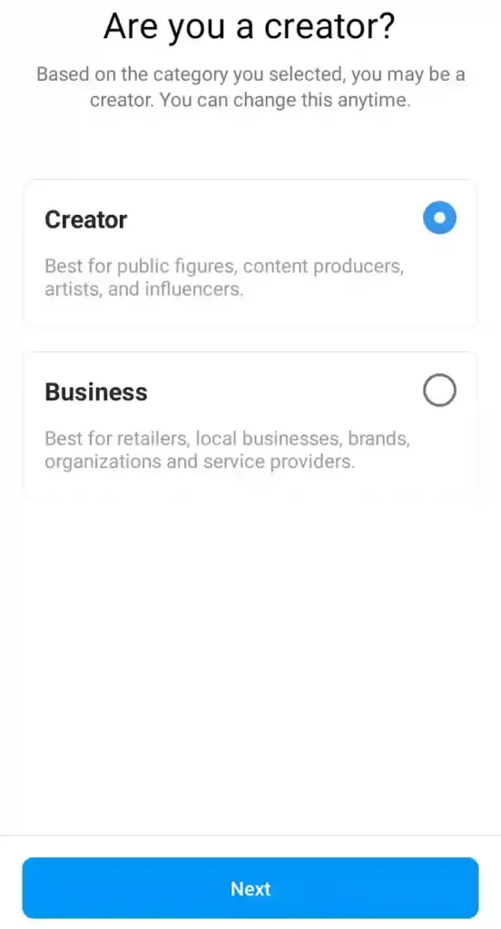 अब उसी प्रकार आपको इस Instagram Page का परपज (Goal) सेलेक्ट करना होगा जिसके लिए सिर्फ दो विकल्प मिलता है पहला Creator दूसरा Business आप दोनो में से कोई सेलेक्ट कर सकते है जिस मकसद के लिए आप यह पेज बना रहे है मैं यहाँ Creator को सेलेक्ट करके नीचे Next पर कि्लक करूंगा