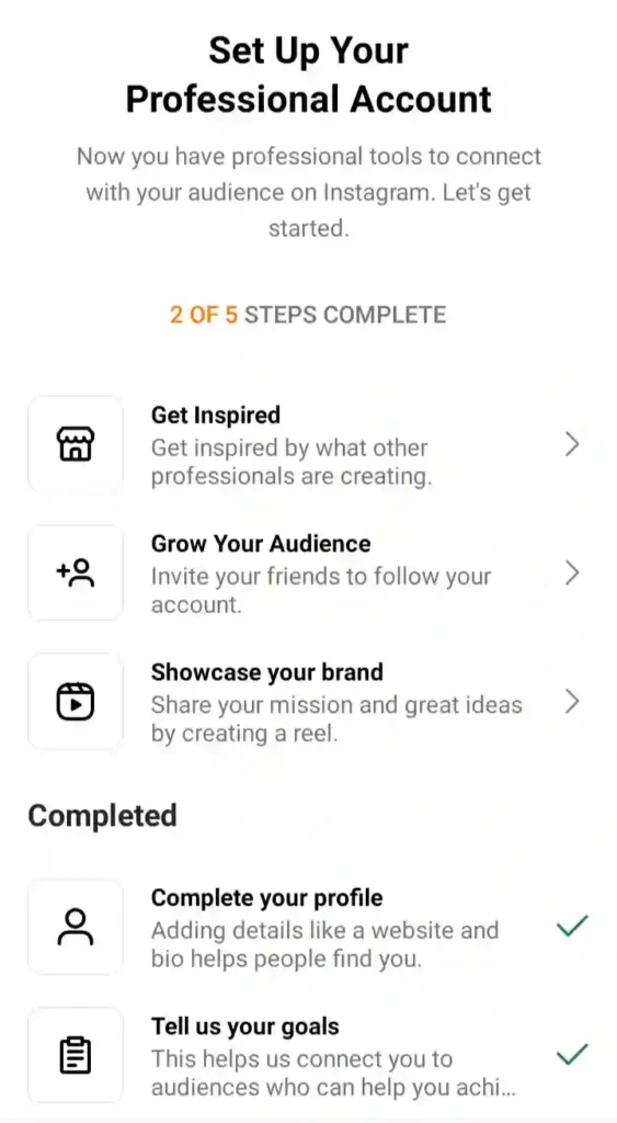 5. Complete Your Profile – अगर आप अपनी प्रोफाइल कंपलिट किये है तो यह ऑप्शन पहले से टिक मार्केट होगा तब आपको यहाँ कुछ करने की जरूरत नही होगी अथवा आपको अपने Instagram का प्रोफाइल पूरा करना होगा