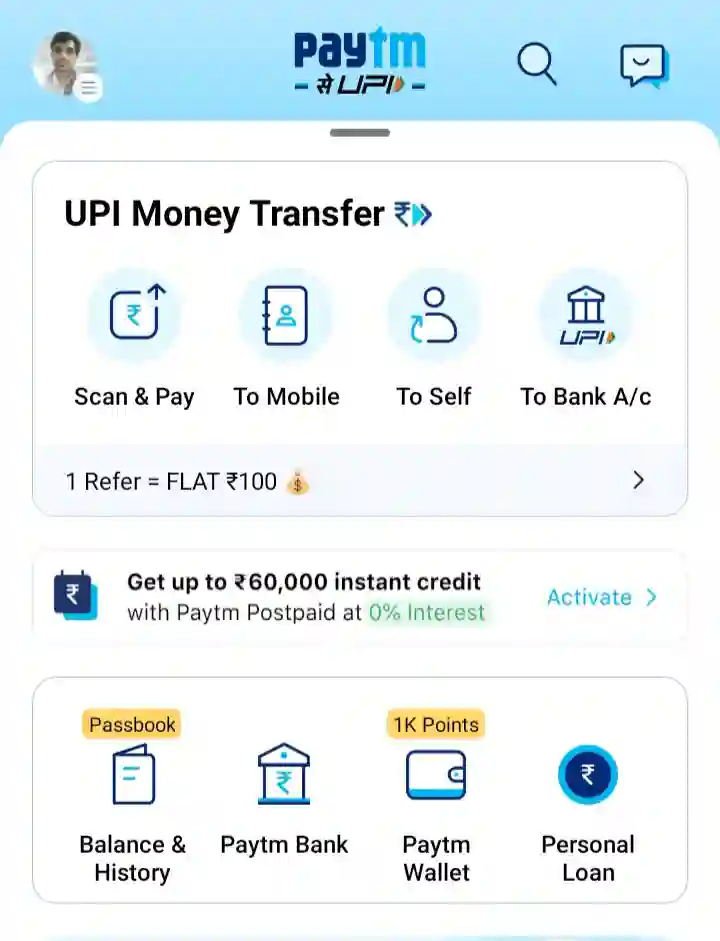 Wallet के पैसे को Bank Account में निकलने के लिए सबसे पहले आपको अपना Paytm App Open करना होगा और उसमें लॉगइन करना होगा जहाँ आपको सामने कुछ इस तरह का ऑप्शन दिखाई देगा।