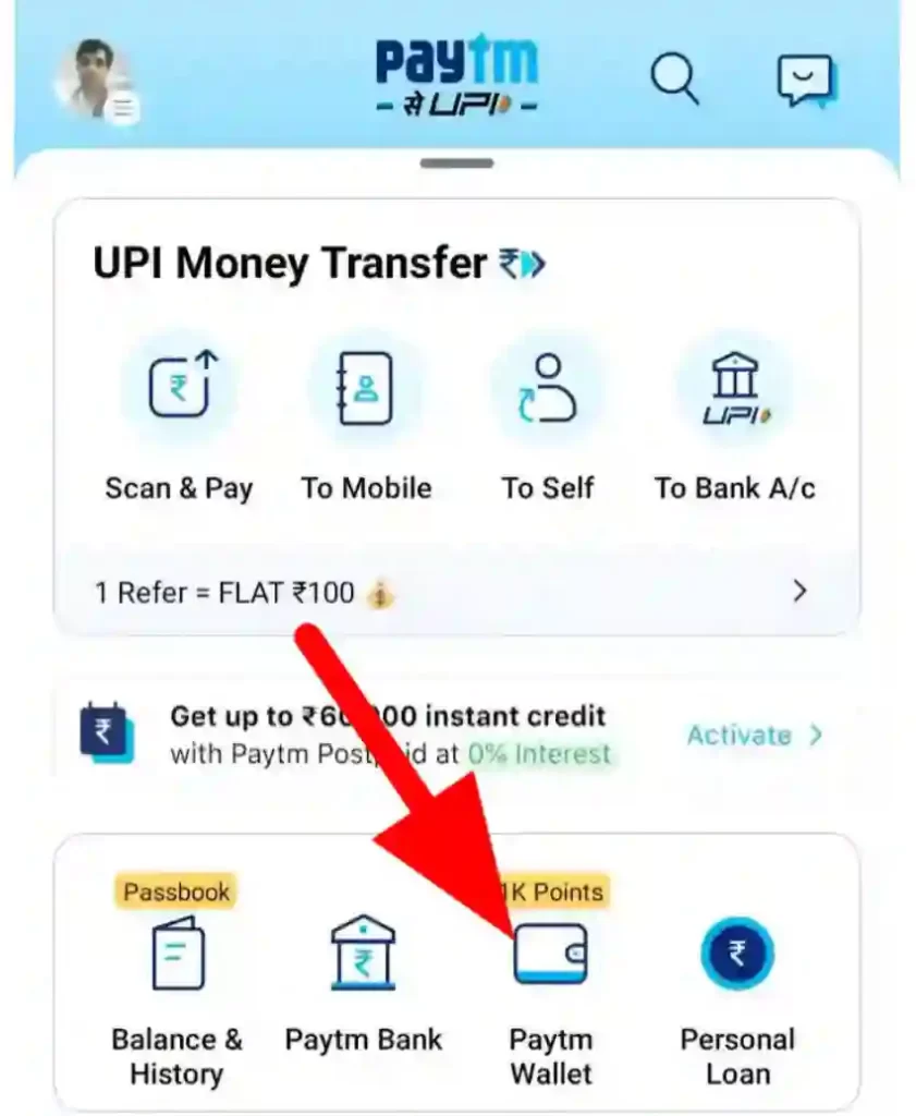 जब आपका Paytm App Open हो जाता है तो अब आपको इस Paytm App में Wallet का ऑप्शन खोजना होगा जो आपको ऊपर में ही आसानी से मिल जायेगा जैसा आप चित्र में देख रहे है तो इसी Wallet पर कि्लक करे।