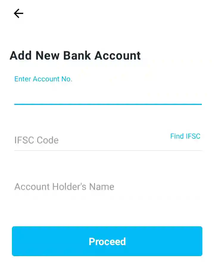 यहाँ पर आपको अपने बैंक का एकाउंट नंबर, IFSC Code और Account होल्डर का नाम भरना है फिर नीचे दिये गये ऑप्शन Proceed पर कि्लक करना है।