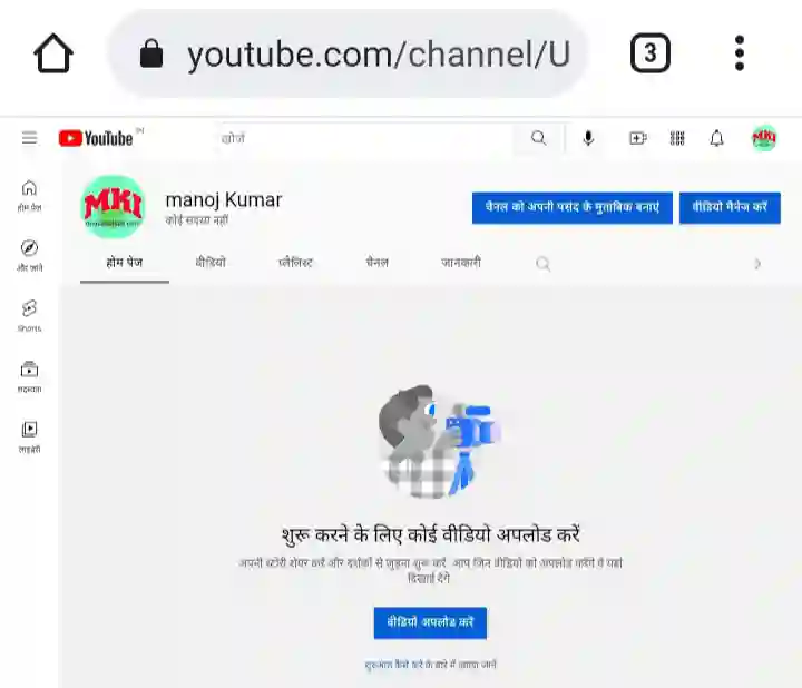 अब आप चैनल को अपने मुताबिक बनाये पर कि्लक करके इस चैनल को अपने हिसाब से बना सकते है YouTube चैनल का नाम भी चेंज कर सकते है और इसको कस्टोमाइज करके जैसा चाहे वैसा बना सकते है और यही से वीडियो अपलोड करे पर कि्लक करके Video भी अपलोड कर सकते है।